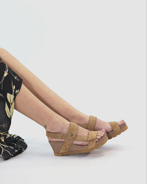 Keilsandalette. Velourleder Camel. Klettverschluss. Lederinnenfutter. Anatomisch Innensohle. Leichte, flexible und robuste Sohle aus Kork und EVA. Absatzhöhe: 6.5 cm. 100% Hergestellt in Spanien.