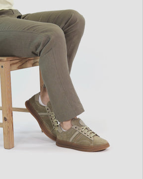 Men's sneakers. Khaki suede. Lace-up Closure. Leather lining. Removable anatomical insole. Flexible and durable rubber sole. Shaft height: 6,7 cm. Heel height: 4.3 cm. 100% Made in Spain.