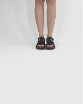 Flat woman's sandals. Black nappa grass leather. Velcro Closure. Leather lining. Anatomical insole. Lightweight, flexible, strong cork and EVA rubber sole. Heel height: 4.5 cm. 100% Made in Spain.