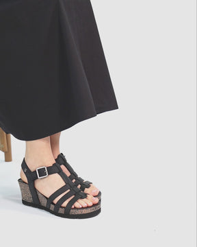Wedge sandals. Black nappa grass leather. Velcro Closure. Leather lining. Anatomical insole. Lightweight, flexible, strong cork and EVA rubber sole. Heel height: 6.5 cm. 100% Made in Spain.