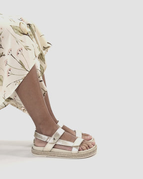 Flat woman's sandals. Gold nappa leather. Velcro Closure. Leather lining. Anatomical insole. Flexible and durable Polyurethane sole. Heel height: 4.5 cm. 100% Made in Spain.