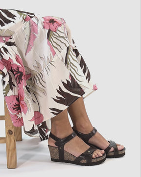 Wedge sandals. Brown Napa Leather. Velcro Closure. Leather lining. Anatomical insole. Lightweight, flexible, strong cork and EVA rubber sole. Heel height: 6.5 cm. 100% Made in Spain.