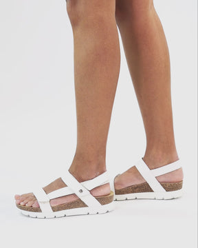 Flat woman's sandals. White Napa Leather. Velcro Closure. Leather lining. Anatomical insole. Lightweight, flexible, strong cork and EVA rubber sole. Heel height: 4.5 cm. 100% Made in Spain.