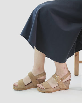 Wedge sandals. Natural suede. Velcro Closure. Leather lining. Anatomical insole. Lightweight, flexible, strong cork and EVA rubber sole. Heel height: 6.5 cm. 100% Made in Spain.